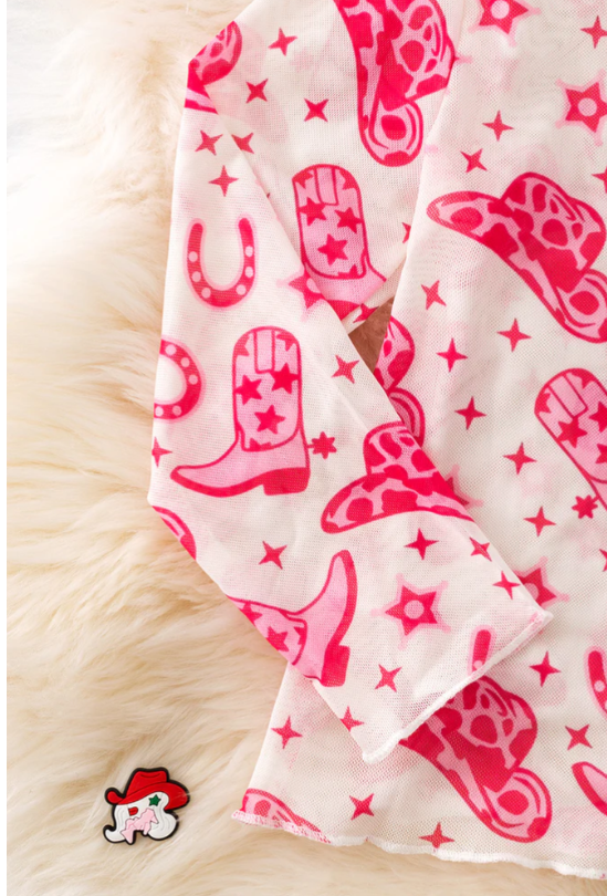 Pink western hat & cowgirl boot printed mesh long sleeve top.